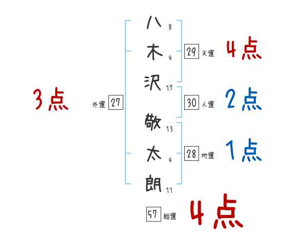 総運![]() | 八木沢敬太朗さんの総運は57画の4つ星!向上心があり人望がある。地位を得る。 あなたの人生を表す1番重要な運勢です。生涯を通じて影響する総合運となり、主に50歳以降の晩年期に影響を及ぼします。 |