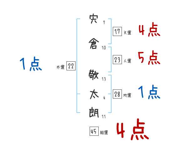総運![]() | 宍倉敬太朗さんの総運は45画の4つ星!もくもくと物事を進め達成する。地味な努力家。 あなたの人生を表す1番重要な運勢です。生涯を通じて影響する総合運となり、主に50歳以降の晩年期に影響を及ぼします。 |
