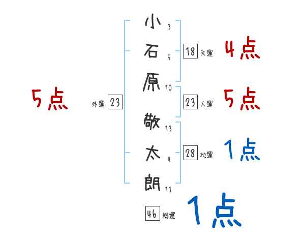 外運![]() | 小石原敬太朗さんの外運は23画の5つ星!想像力に優れ活力がある。一代で成功し名誉を手に入れる。 生活面を象徴する運勢です。外部から受ける影響力を表し、結婚運、家庭運や職場、環境への順応性を表します。 |