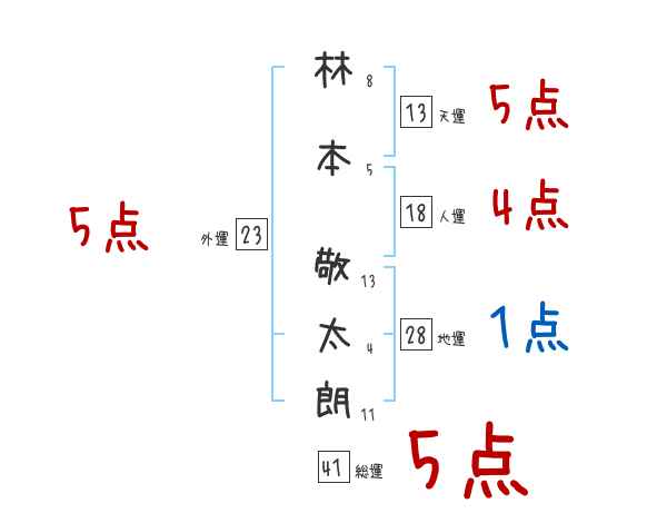 総運![]() | 林本敬太朗さんの総運は41画の5つ星!大志を抱き、目標に向かって実力を発揮し達成する。温和な性格。 あなたの人生を表す1番重要な運勢です。生涯を通じて影響する総合運となり、主に50歳以降の晩年期に影響を及ぼします。 |