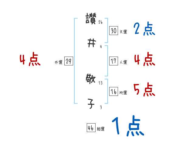 天運![]() | 讃井敬子さんの天運は30画の2つ星!浮き沈みの激しさに注意しましょう。 家系が持つ宿命的な運勢を表します。祖先から受け継いだ苗字ですので自分の力が及びません。家柄を象徴します。 |