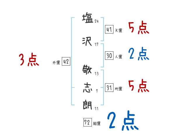 外運![]() | 塩沢敬志朗さんの外運は42画の3つ星!病気に注意。多芸であるが消極的でおとなしい。 生活面を象徴する運勢です。外部から受ける影響力を表し、結婚運、家庭運や職場、環境への順応性を表します。 |