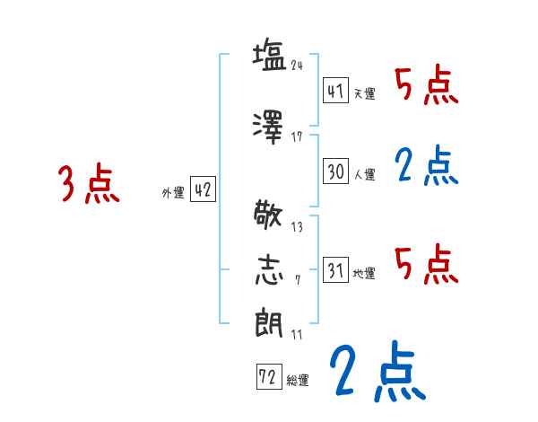 外運![]() | 塩澤敬志朗さんの外運は42画の3つ星!病気に注意。多芸であるが消極的でおとなしい。 生活面を象徴する運勢です。外部から受ける影響力を表し、結婚運、家庭運や職場、環境への順応性を表します。 |