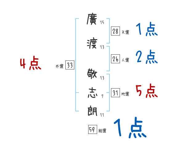 天運![]() | 廣渡敬志朗さんの天運は28画の1つ星!家庭環境に注意。スポーツで活躍できる能力があるかも。 家系が持つ宿命的な運勢を表します。祖先から受け継いだ苗字ですので自分の力が及びません。家柄を象徴します。 |