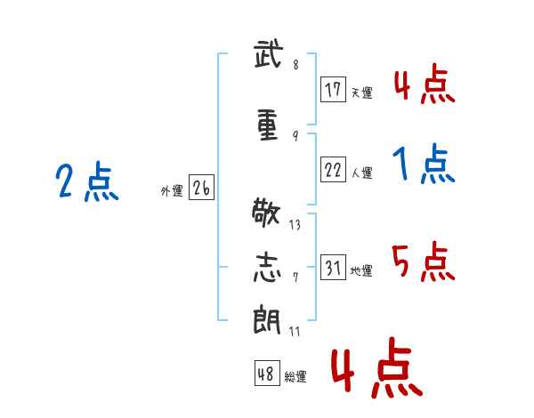 天運![]() | 武重敬志朗さんの天運は17画の4つ星!積極的な行動力。地位を気づき財産を手に入れる。純粋な心と直感力。 家系が持つ宿命的な運勢を表します。祖先から受け継いだ苗字ですので自分の力が及びません。家柄を象徴します。 |