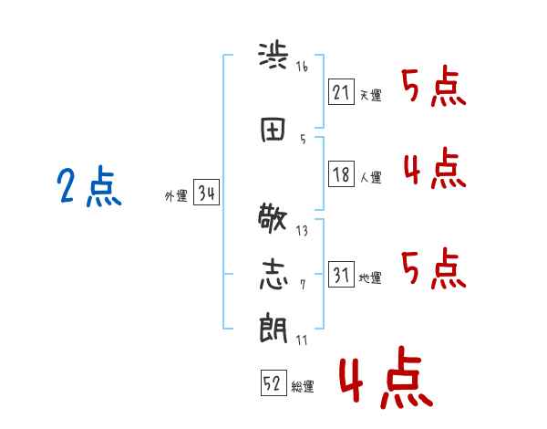 外運![]() | 渋田敬志朗さんの外運は34画の2つ星!独創性に優れるが、自尊心が強く災難に注意しましょう。 生活面を象徴する運勢です。外部から受ける影響力を表し、結婚運、家庭運や職場、環境への順応性を表します。 |