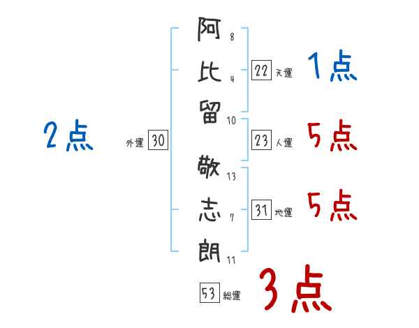 総運![]() | 阿比留敬志朗さんの総運は53画の3つ星!やや見栄っ張りで虚栄心がある。散財に注意。 あなたの人生を表す1番重要な運勢です。生涯を通じて影響する総合運となり、主に50歳以降の晩年期に影響を及ぼします。 |