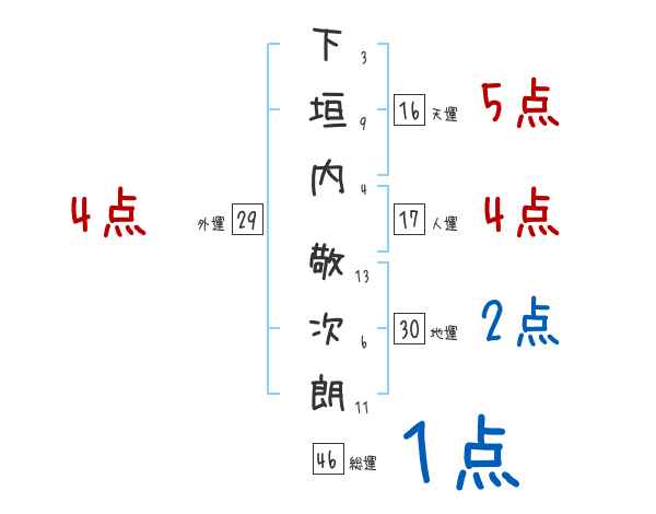 天運![]() | 下垣内敬次朗さんの天運は16画の5つ星!人望が厚く大きく発展する。逆転成功が見える。 家系が持つ宿命的な運勢を表します。祖先から受け継いだ苗字ですので自分の力が及びません。家柄を象徴します。 |