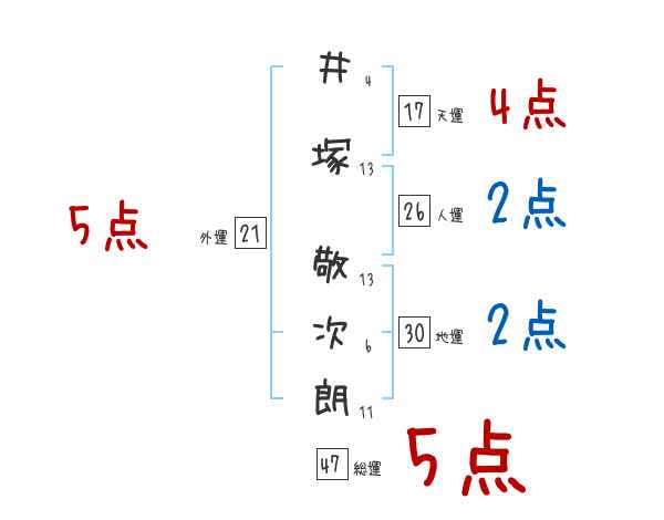 外運![]() | 井塚敬次朗さんの外運は21画の5つ星!統率力がある。独立し成功する。名誉を手に入れる。 生活面を象徴する運勢です。外部から受ける影響力を表し、結婚運、家庭運や職場、環境への順応性を表します。 |