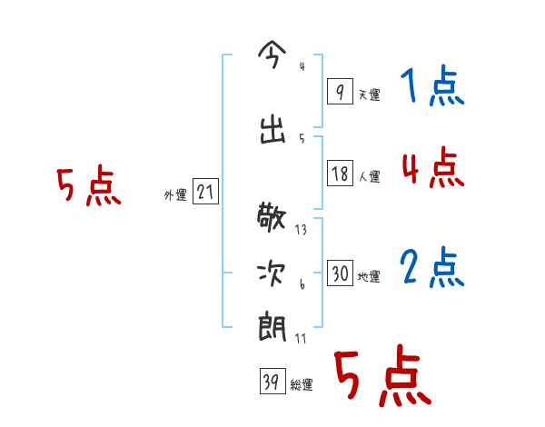 総運![]() | 今出敬次朗さんの総運は39画の5つ星!社交性に優れ人望が厚い。人の上に立ち成功する。 あなたの人生を表す1番重要な運勢です。生涯を通じて影響する総合運となり、主に50歳以降の晩年期に影響を及ぼします。 |