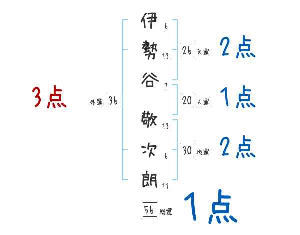 天運![]() | 伊勢谷敬次朗さんの天運は26画の2つ星!波瀾万丈かも。信頼できる人を大事にしましょう。 家系が持つ宿命的な運勢を表します。祖先から受け継いだ苗字ですので自分の力が及びません。家柄を象徴します。 |