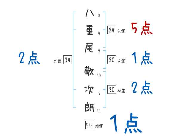 天運![]() | 八重尾敬次朗さんの天運は24画の5つ星!家庭運が良く順調な人生。金運にも恵まれる。 家系が持つ宿命的な運勢を表します。祖先から受け継いだ苗字ですので自分の力が及びません。家柄を象徴します。 |