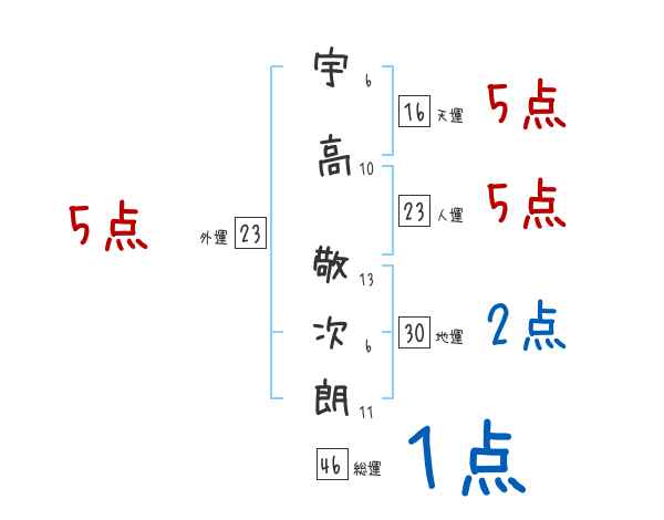 外運![]() | 宇高敬次朗さんの外運は23画の5つ星!想像力に優れ活力がある。一代で成功し名誉を手に入れる。 生活面を象徴する運勢です。外部から受ける影響力を表し、結婚運、家庭運や職場、環境への順応性を表します。 |