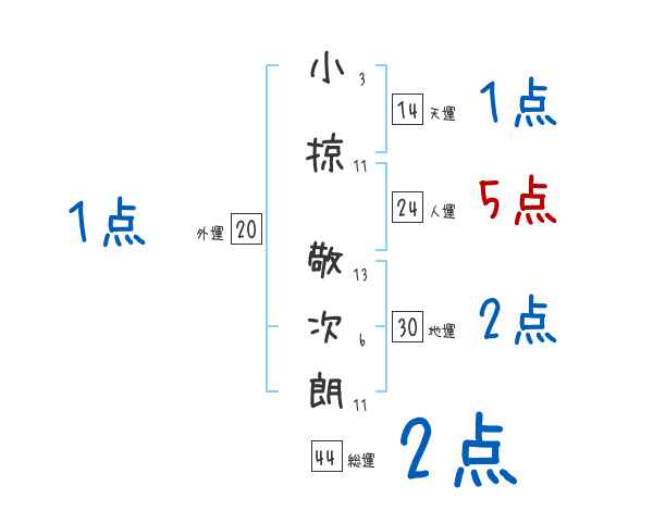 総運![]() | 小掠敬次朗さんの総運は44画の2つ星!誠実で慎重な性格。物事を考えすぎないように注意しましょう。 あなたの人生を表す1番重要な運勢です。生涯を通じて影響する総合運となり、主に50歳以降の晩年期に影響を及ぼします。 |