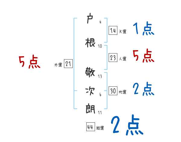 外運![]() | 戸根敬次朗さんの外運は21画の5つ星!統率力がある。独立し成功する。名誉を手に入れる。 生活面を象徴する運勢です。外部から受ける影響力を表し、結婚運、家庭運や職場、環境への順応性を表します。 |