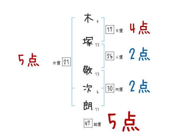 総運![]() | 木塚敬次朗さんの総運は47画の5つ星!実力が開花し発展する円満な人生。財に恵まれる。 あなたの人生を表す1番重要な運勢です。生涯を通じて影響する総合運となり、主に50歳以降の晩年期に影響を及ぼします。 |