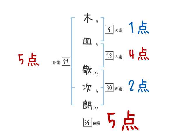 総運![]() | 木皿敬次朗さんの総運は39画の5つ星!社交性に優れ人望が厚い。人の上に立ち成功する。 あなたの人生を表す1番重要な運勢です。生涯を通じて影響する総合運となり、主に50歳以降の晩年期に影響を及ぼします。 |