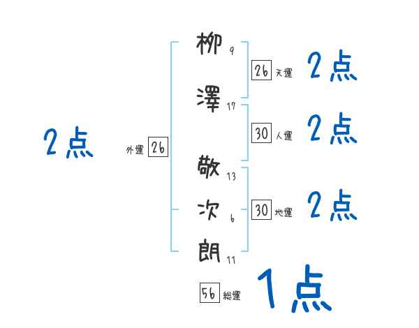 外運![]() | 栁澤敬次朗さんの外運は26画の2つ星!波瀾万丈かも。信頼できる人を大事にしましょう。 生活面を象徴する運勢です。外部から受ける影響力を表し、結婚運、家庭運や職場、環境への順応性を表します。 |