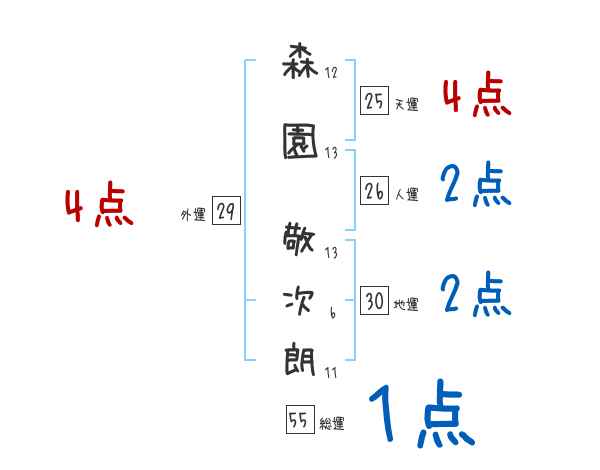 天運![]() | 森園敬次朗さんの天運は25画の4つ星!個性があり才能があふれる。強運の持ち主で発展する。 家系が持つ宿命的な運勢を表します。祖先から受け継いだ苗字ですので自分の力が及びません。家柄を象徴します。 |