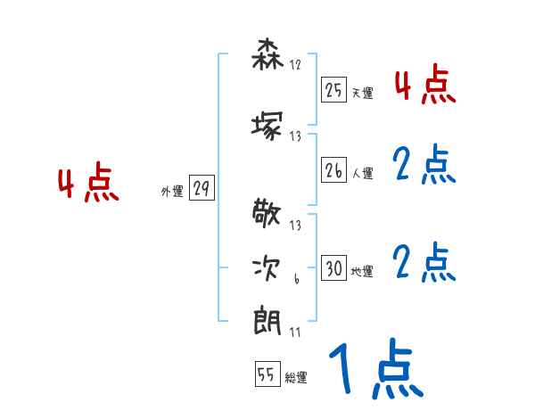 天運![]() | 森塚敬次朗さんの天運は25画の4つ星!個性があり才能があふれる。強運の持ち主で発展する。 家系が持つ宿命的な運勢を表します。祖先から受け継いだ苗字ですので自分の力が及びません。家柄を象徴します。 |
