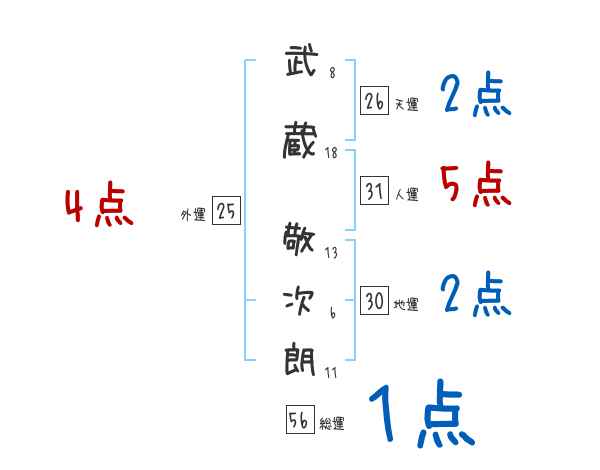 天運![]() | 武蔵敬次朗さんの天運は26画の2つ星!波瀾万丈かも。信頼できる人を大事にしましょう。 家系が持つ宿命的な運勢を表します。祖先から受け継いだ苗字ですので自分の力が及びません。家柄を象徴します。 |