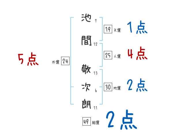 外運![]() | 池間敬次朗さんの外運は24画の5つ星!家庭運が良く順調な人生。金運にも恵まれる。 生活面を象徴する運勢です。外部から受ける影響力を表し、結婚運、家庭運や職場、環境への順応性を表します。 |