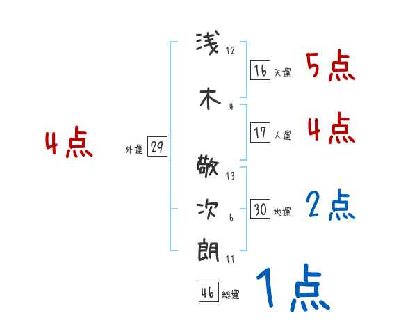 天運![]() | 浅木敬次朗さんの天運は16画の5つ星!人望が厚く大きく発展する。逆転成功が見える。 家系が持つ宿命的な運勢を表します。祖先から受け継いだ苗字ですので自分の力が及びません。家柄を象徴します。 |