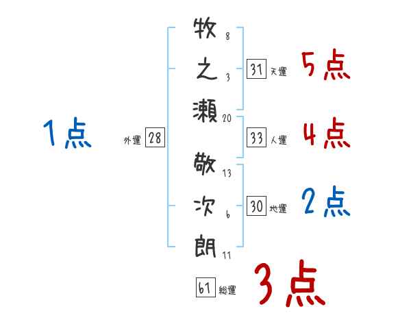 牧之瀬敬次朗さんの総運は61画の3つ星
