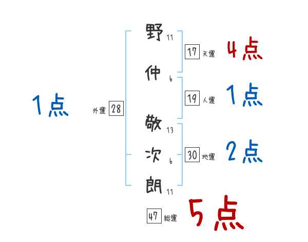 人運![]() | 野仲敬次朗さんの人運は19画の1つ星!優れた才能を持ちますが、協調性が足りないことも。周りの人と協力する事を意識しましょう。 性格や才能などを表す2番目に重要な運勢です。人間関係や協調性、社会的な成功に影響します。主に20歳から50歳ぐらいまでの中年期の運勢を表します。 |