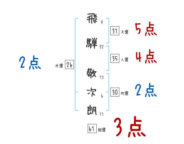 天運![]() | 飛騨敬次朗さんの天運は31画の5つ星!社交性があり判断力に優れる。順風満帆な人生で円満な生活。 家系が持つ宿命的な運勢を表します。祖先から受け継いだ苗字ですので自分の力が及びません。家柄を象徴します。 |
