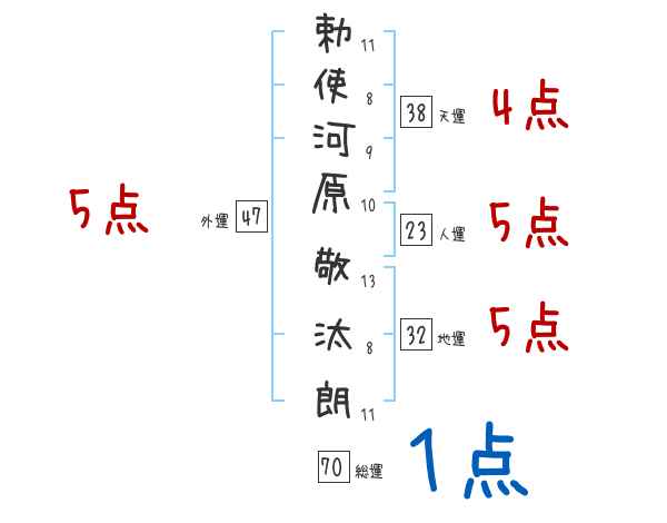外運![]() | 勅使河原敬汰朗さんの外運は47画の5つ星!実力が開花し発展する円満な人生。財に恵まれる。 生活面を象徴する運勢です。外部から受ける影響力を表し、結婚運、家庭運や職場、環境への順応性を表します。 |