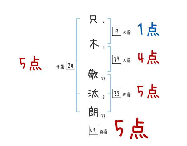 外運![]() | 只木敬汰朗さんの外運は24画の5つ星!家庭運が良く順調な人生。金運にも恵まれる。 生活面を象徴する運勢です。外部から受ける影響力を表し、結婚運、家庭運や職場、環境への順応性を表します。 |