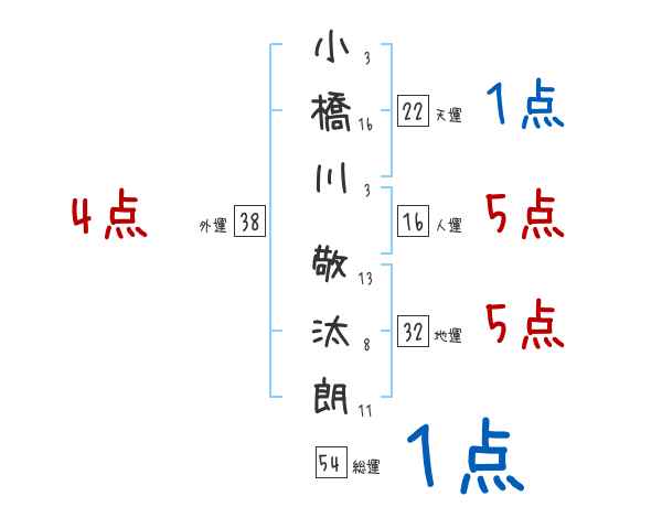 人運![]() | 小橋川敬汰朗さんの人運は16画の5つ星!人望が厚く大きく発展する。逆転成功が見える。 性格や才能などを表す2番目に重要な運勢です。人間関係や協調性、社会的な成功に影響します。主に20歳から50歳ぐらいまでの中年期の運勢を表します。 |