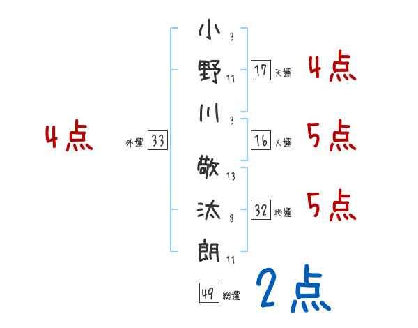 天運![]() | 小野川敬汰朗さんの天運は17画の4つ星!積極的な行動力。地位を気づき財産を手に入れる。純粋な心と直感力。 家系が持つ宿命的な運勢を表します。祖先から受け継いだ苗字ですので自分の力が及びません。家柄を象徴します。 |