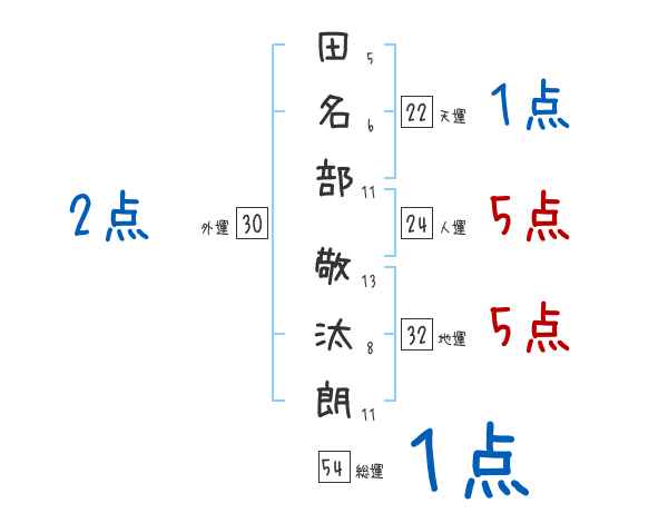 天運![]() | 田名部敬汰朗さんの天運は22画の1つ星!努力することが苦手ないっぽう手先が器用。芸術性にも優れる。 家系が持つ宿命的な運勢を表します。祖先から受け継いだ苗字ですので自分の力が及びません。家柄を象徴します。 |