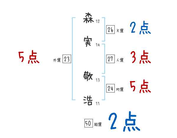 総運![]() | 森実敬浩さんの総運は50画の2つ星!浮き沈みが激しく不安定。しりすぼみに衰退しやすいので注意しましょう。 あなたの人生を表す1番重要な運勢です。生涯を通じて影響する総合運となり、主に50歳以降の晩年期に影響を及ぼします。 |