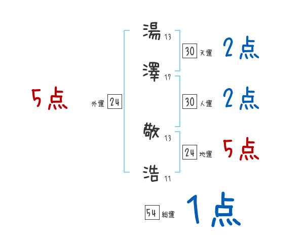 外運![]() | 湯澤敬浩さんの外運は24画の5つ星!家庭運が良く順調な人生。金運にも恵まれる。 生活面を象徴する運勢です。外部から受ける影響力を表し、結婚運、家庭運や職場、環境への順応性を表します。 |