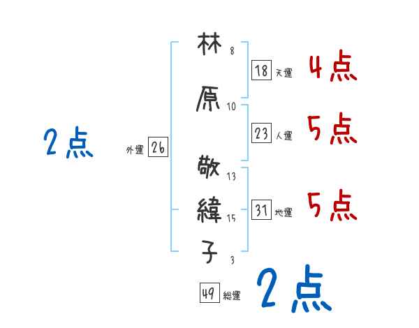 外運![]() | 林原敬緯子さんの外運は26画の2つ星!波瀾万丈かも。信頼できる人を大事にしましょう。 生活面を象徴する運勢です。外部から受ける影響力を表し、結婚運、家庭運や職場、環境への順応性を表します。 |