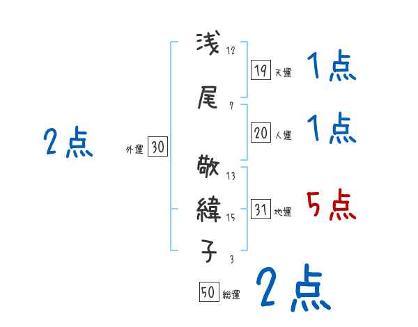 天運![]() | 浅尾敬緯子さんの天運は19画の1つ星!優れた才能を持ちますが、協調性が足りないことも。周りの人と協力する事を意識しましょう。 家系が持つ宿命的な運勢を表します。祖先から受け継いだ苗字ですので自分の力が及びません。家柄を象徴します。 |