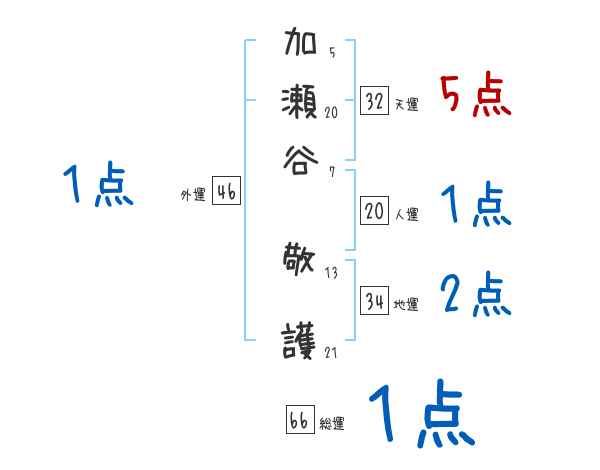天運![]() | 加瀬谷敬護さんの天運は32画の5つ星!柔軟性があり成功する。チャンスが多く金運が良い。 家系が持つ宿命的な運勢を表します。祖先から受け継いだ苗字ですので自分の力が及びません。家柄を象徴します。 |