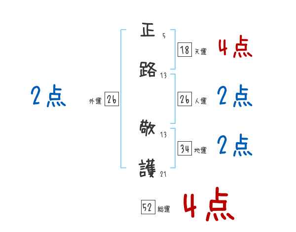 外運![]() | 正路敬護さんの外運は26画の2つ星!波瀾万丈かも。信頼できる人を大事にしましょう。 生活面を象徴する運勢です。外部から受ける影響力を表し、結婚運、家庭運や職場、環境への順応性を表します。 |