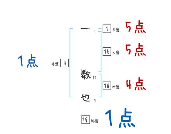 天運![]() | 一数也さんの天運は1画の5つ星!行動力、指導力があり出世し繁栄する。幸運に恵まれる。 家系が持つ宿命的な運勢を表します。祖先から受け継いだ苗字ですので自分の力が及びません。家柄を象徴します。 |