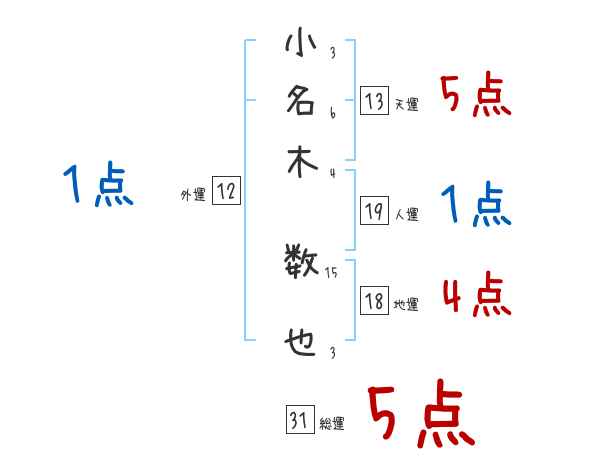 天運![]() | 小名木数也さんの天運は13画の5つ星!才能に恵まれ人気がある。名声を手に入れる。円満な人生。 家系が持つ宿命的な運勢を表します。祖先から受け継いだ苗字ですので自分の力が及びません。家柄を象徴します。 |