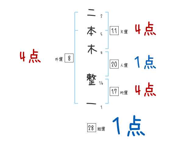 総運![]() | 二本木整一さんの総運は28画の1つ星!家庭環境に注意。スポーツで活躍できる能力があるかも。 あなたの人生を表す1番重要な運勢です。生涯を通じて影響する総合運となり、主に50歳以降の晩年期に影響を及ぼします。 |