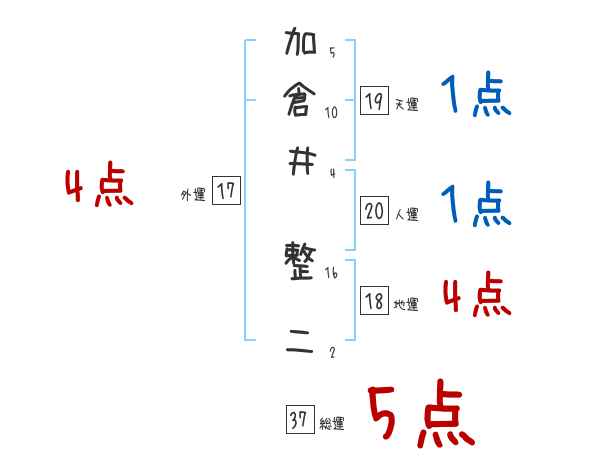 天運![]() | 加倉井整二さんの天運は19画の1つ星!優れた才能を持ちますが、協調性が足りないことも。周りの人と協力する事を意識しましょう。 家系が持つ宿命的な運勢を表します。祖先から受け継いだ苗字ですので自分の力が及びません。家柄を象徴します。 |