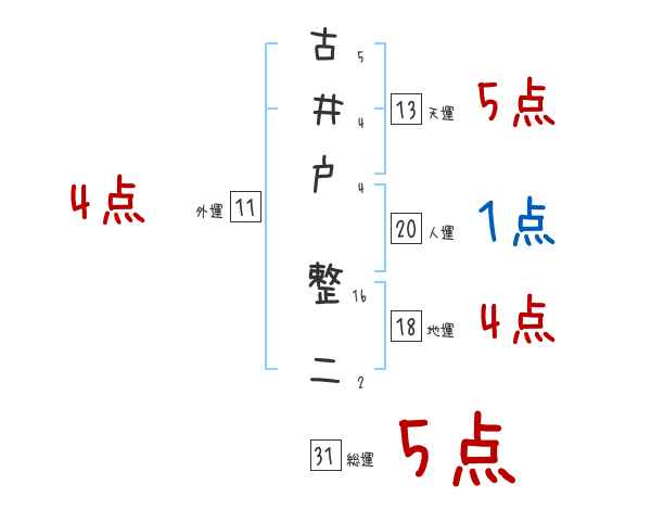 総運![]() | 古井戸整二さんの総運は31画の5つ星!社交性があり判断力に優れる。順風満帆な人生で円満な生活。 あなたの人生を表す1番重要な運勢です。生涯を通じて影響する総合運となり、主に50歳以降の晩年期に影響を及ぼします。 |