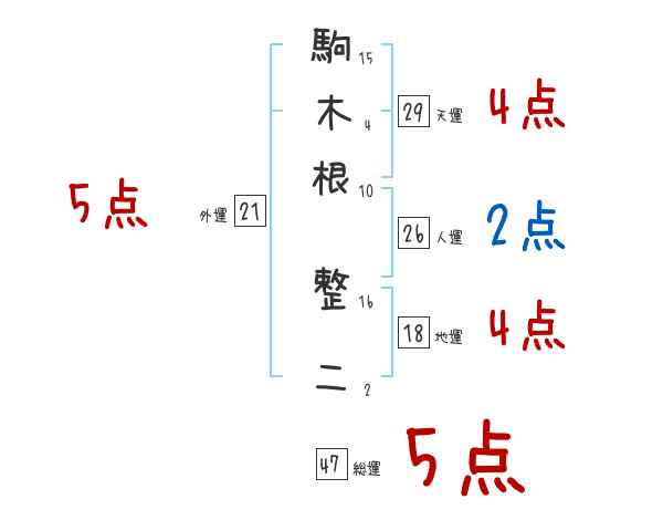 外運![]() | 駒木根整二さんの外運は21画の5つ星!統率力がある。独立し成功する。名誉を手に入れる。 生活面を象徴する運勢です。外部から受ける影響力を表し、結婚運、家庭運や職場、環境への順応性を表します。 |