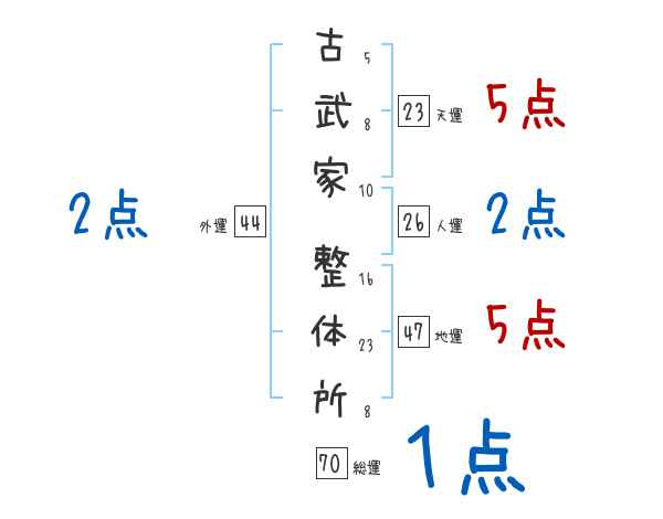 総運![]() | 古武家整体所さんの総運は70画の1つ星!恵まれず苦境に立たされることも。自滅しないように周りの助けを借りましょう。 あなたの人生を表す1番重要な運勢です。生涯を通じて影響する総合運となり、主に50歳以降の晩年期に影響を及ぼします。 |