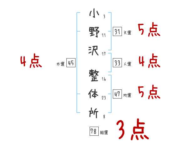 総運![]() | 小野沢整体所さんの総運は78画の3つ星!誠実な性格。信念が多少弱い。 あなたの人生を表す1番重要な運勢です。生涯を通じて影響する総合運となり、主に50歳以降の晩年期に影響を及ぼします。 |