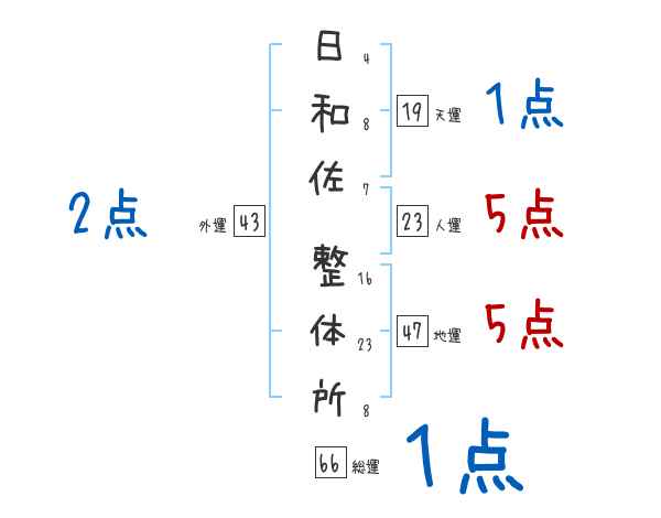 天運![]() | 日和佐整体所さんの天運は19画の1つ星!優れた才能を持ちますが、協調性が足りないことも。周りの人と協力する事を意識しましょう。 家系が持つ宿命的な運勢を表します。祖先から受け継いだ苗字ですので自分の力が及びません。家柄を象徴します。 |